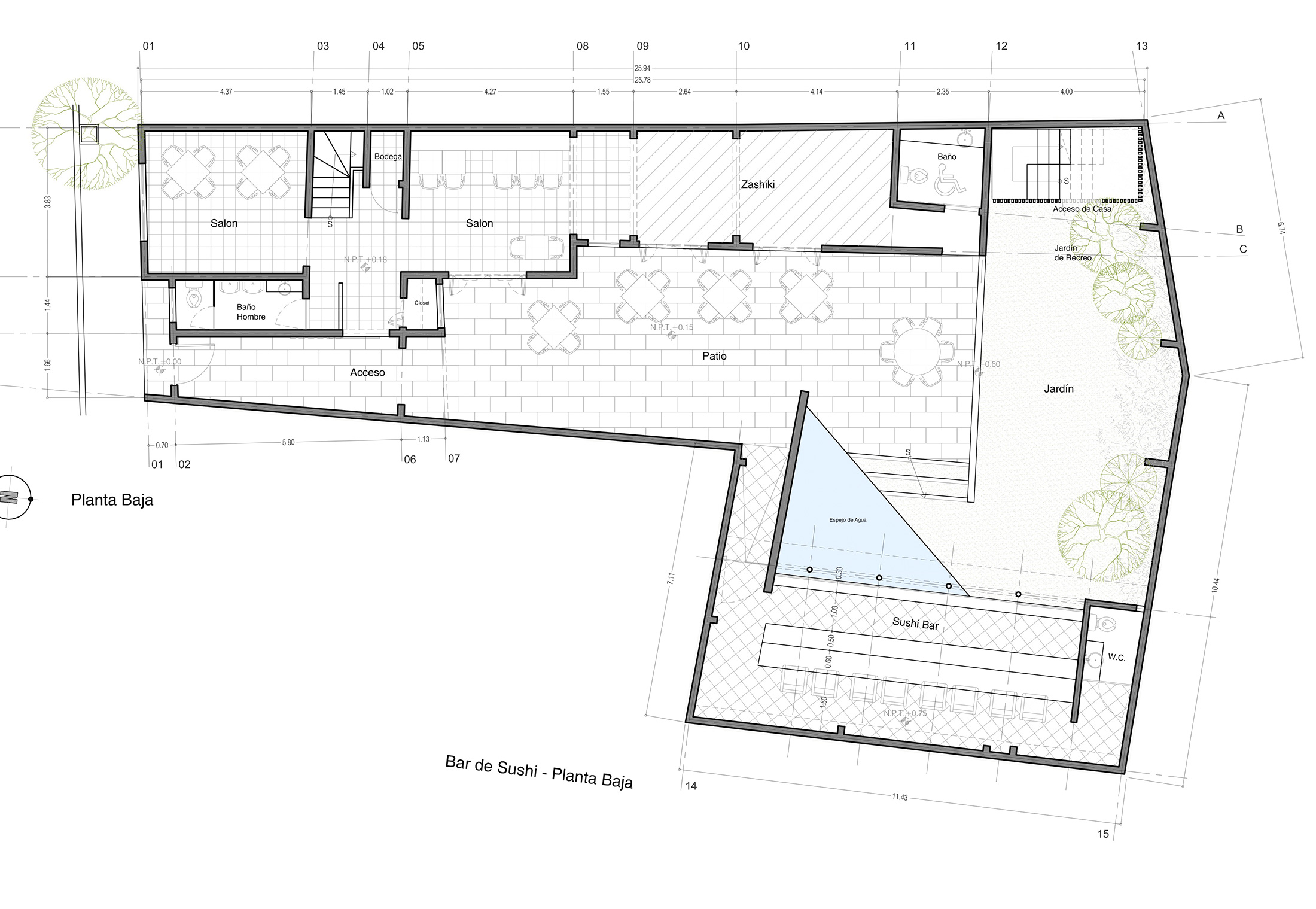 寿司カウンターのある離れには、水盤を設けて空間に静けさと緊張感をもたらしました。既存の壁や構造は部分的に保存・補強し、傷みのある箇所は丁寧に取り壊すことで、過去と現在をつなぐ設計としています。