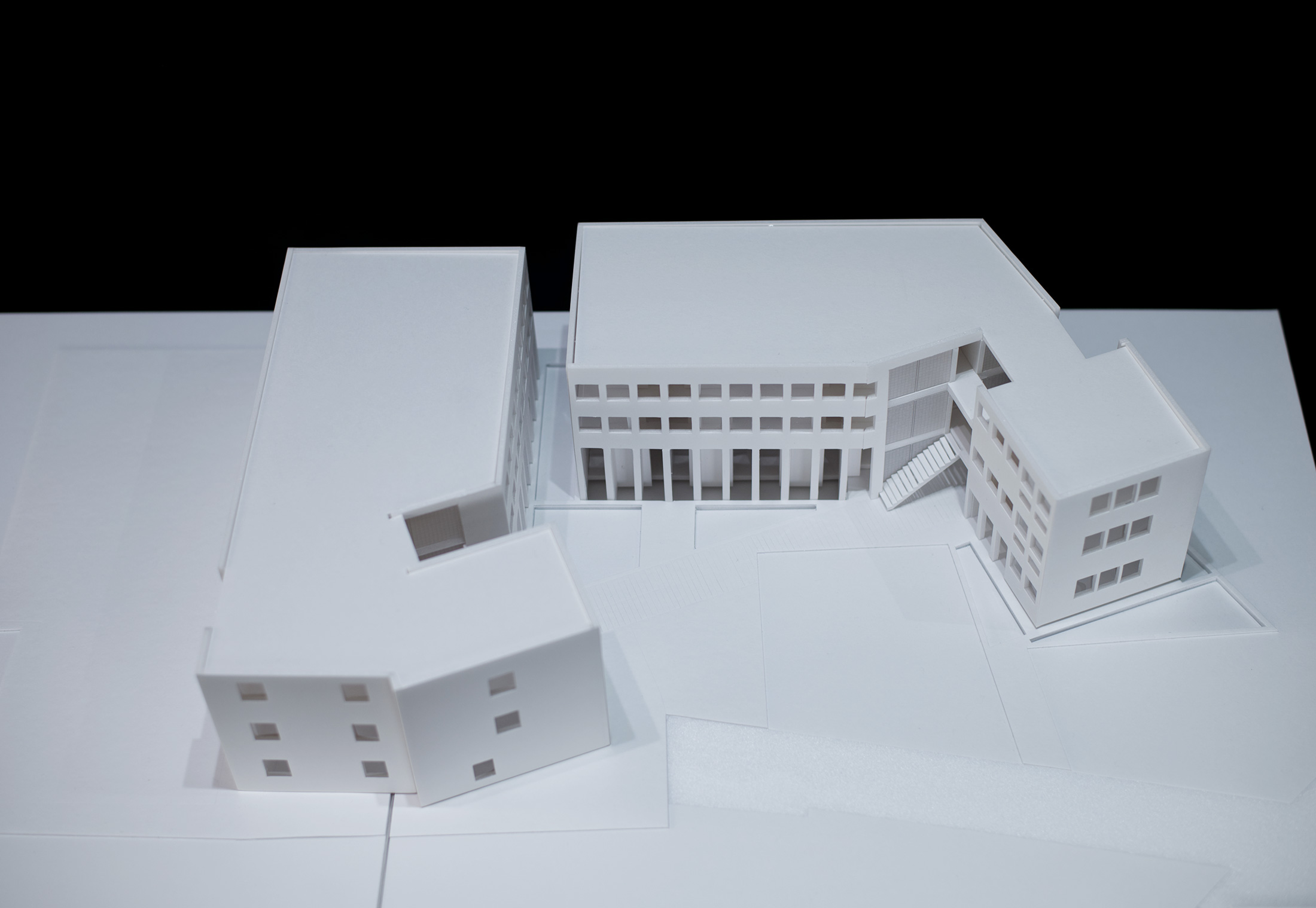 また、連続する壁を設けることで、リズムを生み出しています。これらの壁は構造的な安定性を高める役割も果たしています。 2棟の階段とアプローチを一直線上に配置することで、建築全体に統一感をもたせ、一体感のある空間を創出しました。