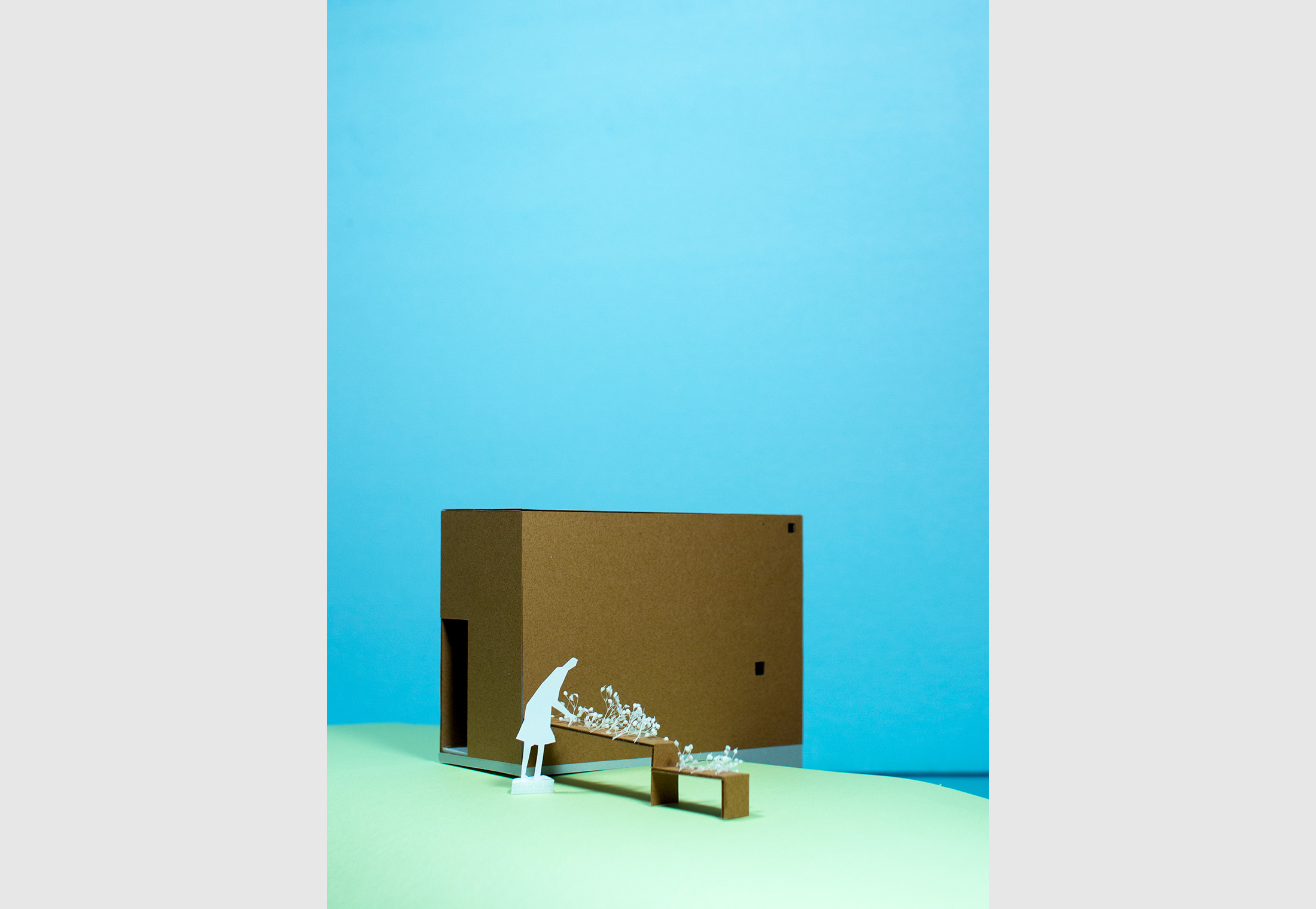 建物は周囲の広大な公園と対比するように、細く閉じた構成としました。 正面の小さな開口からは、遠くの海へと視線が抜けます。 空間に入った人は、視覚や音のスケールが絞られることで、広がりの中に一点の静けさを感じ取ることができます。