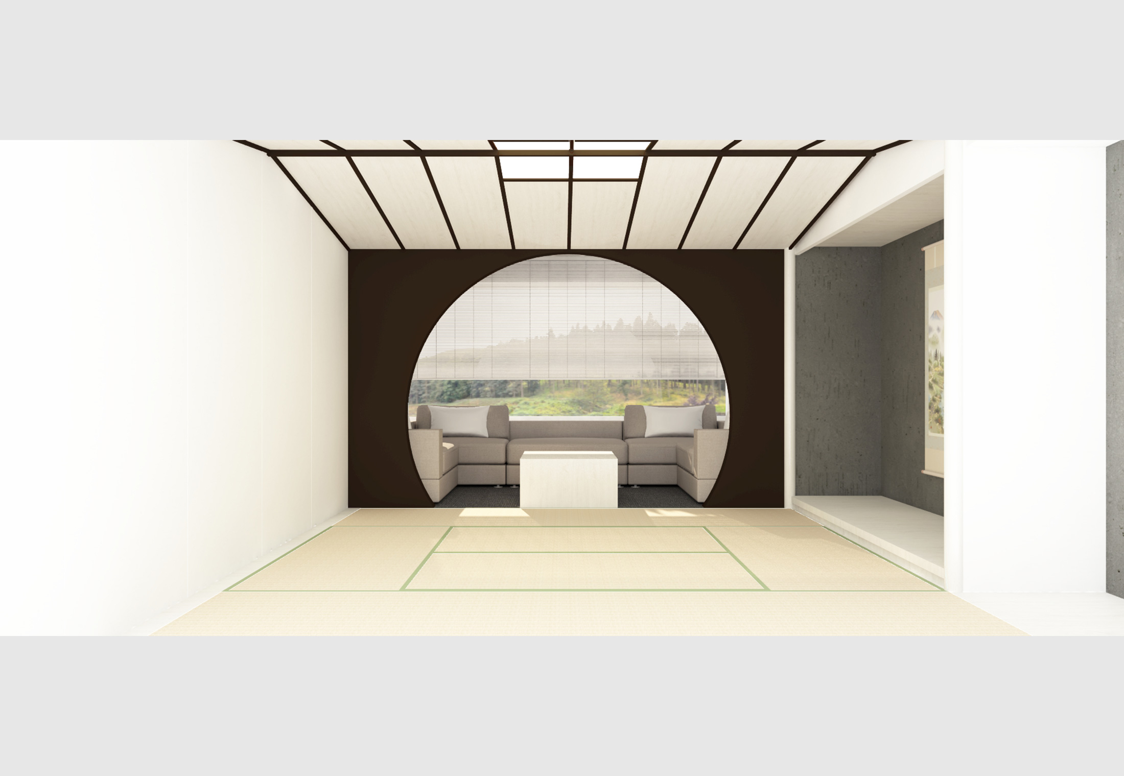 座ったときにちょうど目の高さで風景が見えるよう、ソファ越しに大きなピクチャーウィンドウを配置。 その前には半円の開口を設け、茶室のにじり口のように景色をフレーミングしています。